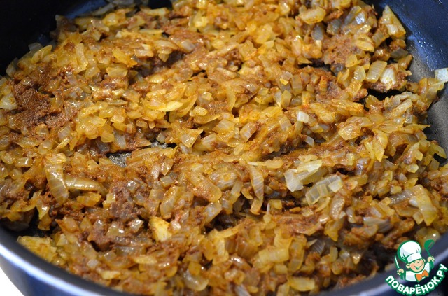 2. Лук порезать на достаточно мелкие кубики. Разогреть масло в сковороде и обжарить лук до прозрачности. Добавить пасту карри и готовить еще минуту на среднем огне, помешивая.
