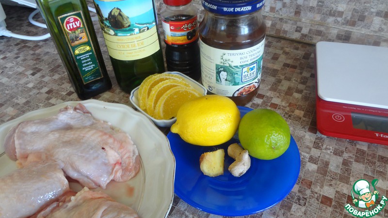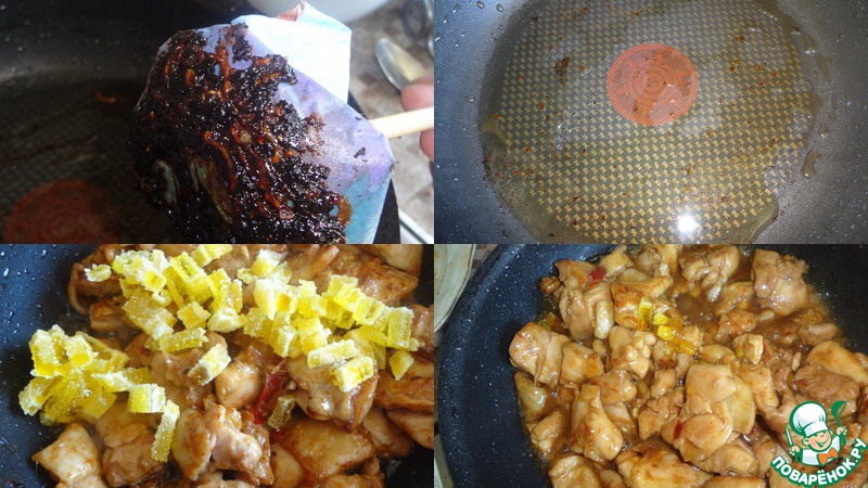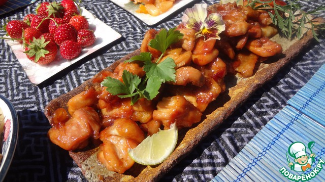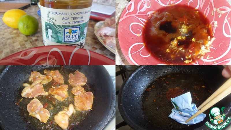 Мы берём нашу курицу, выкладываем всю в сковородку, ДОБАВЛЯЕМ ОГНЯ!!!, выливаем весь оставшийся маринад, в котором лежала курица, измельчённый мармелад и выжимаем сок из лайма. Пробуем на вкус. Если не хватает соли, досолим по вкусу. Если кислоты, то можно добавить немного сока лимона. Кстати, японцы добавляют в этом рецепте лимонный мармелад ложками. Хотя это не такой мармелад, как у нас, а по сути сильно выпаренный лимонный сироп. Я не стала заморачиваться с выпариванием... а просто решила русифицировать. Получилось немного по-другому, но по вкусу очень похоже. Это я пишу для тех знатоков японской кухни, кому захочется бросить в меня камень.
