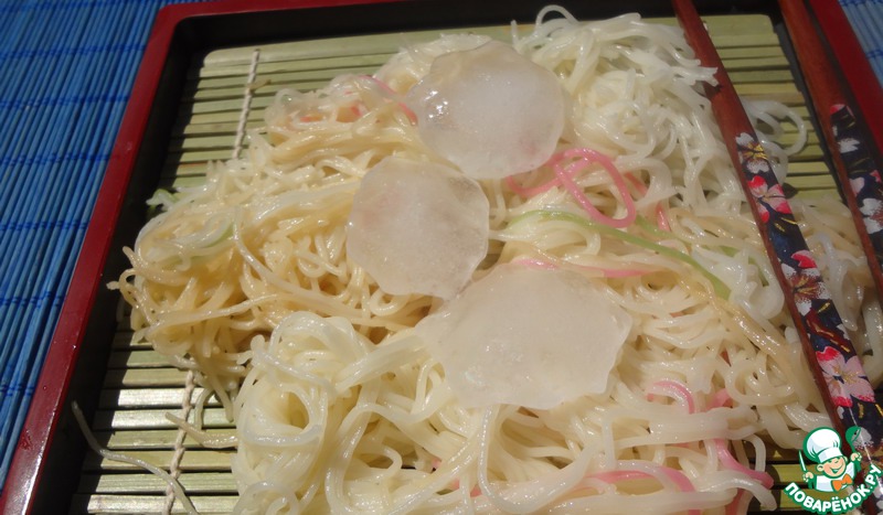 Подаём с отваренной лапшой. Японцы, кстати, в жару лапшу едят со льдом, полив её немного соевым соусом.