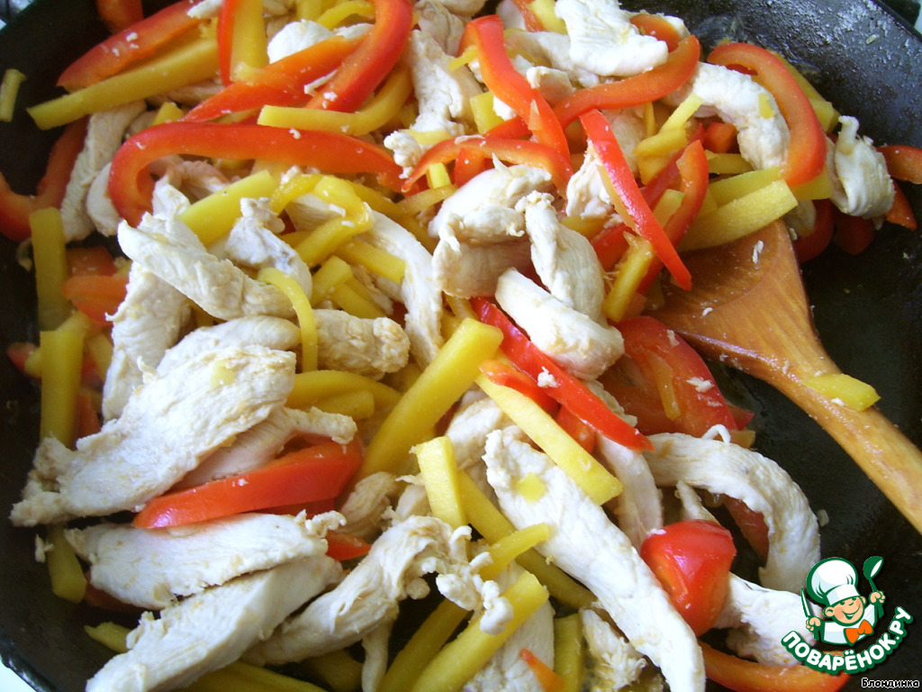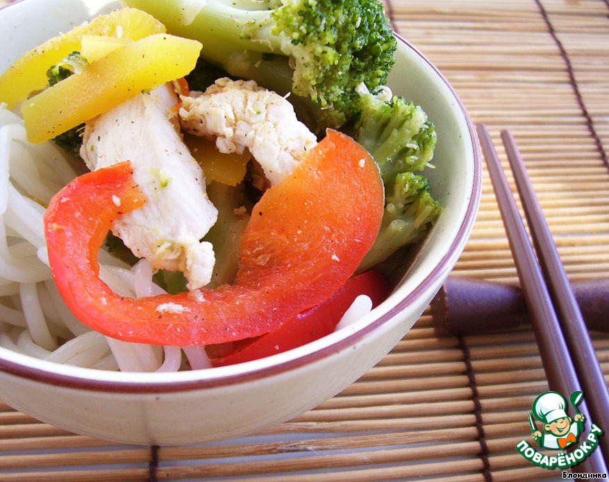 Курицу с овощами подаем с рисом или рисовой лапшой, полив соусом. От себя могу добавить, что и в холодном виде, когда овощи пропитаются соусом, весьма недурно.