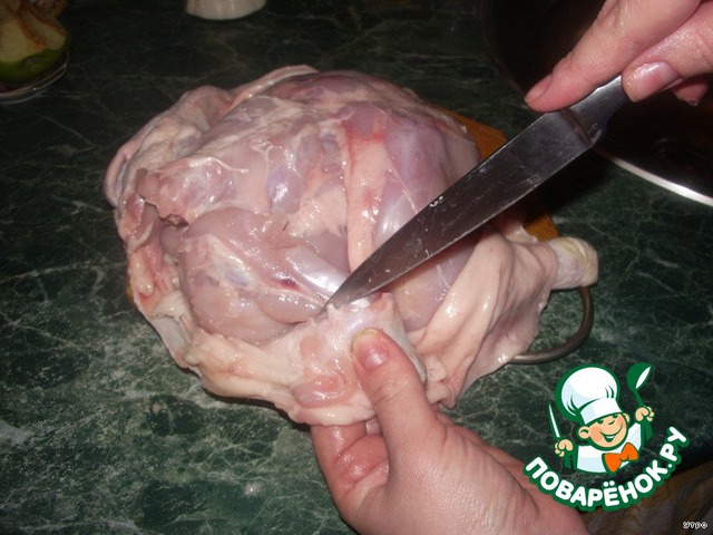 С курицы снимаем кожу. Я начала со спины, снимаем аккуратно, стараясь не повредить кожу. С тушки срезаем грудку и сильно отбиваем. Остальное мясо срезаем и режем на мелкие кусочки.