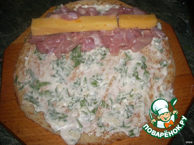 И на третий блин выкладывем майонез, резаную зелень, чеснок , мясо и брусочки сыра - скручиваем.