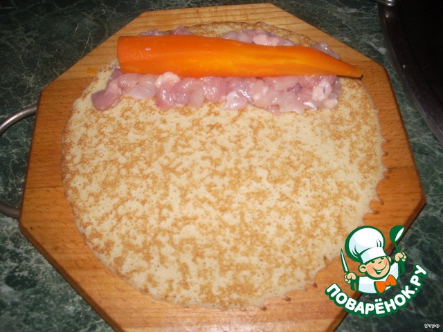 На блин выкладываем измельченное мясо и вареную морковь, сворачиваем в тугой рулетик.