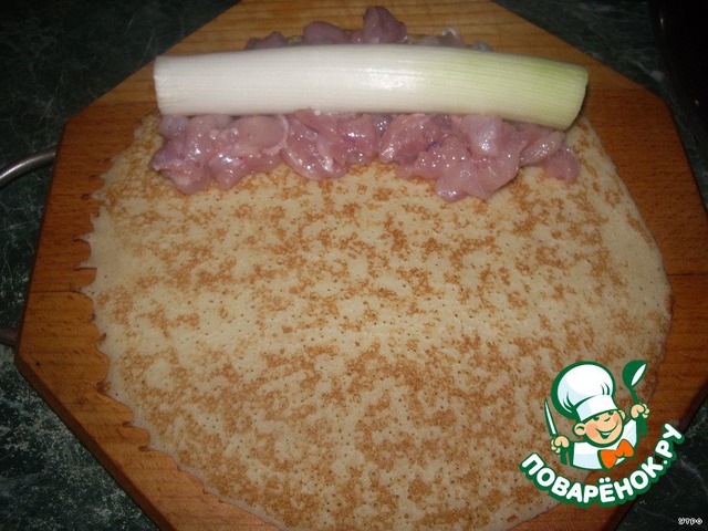 На второй блин кладем мясо+ лук порей - тоже соврачиваем в рулетик.