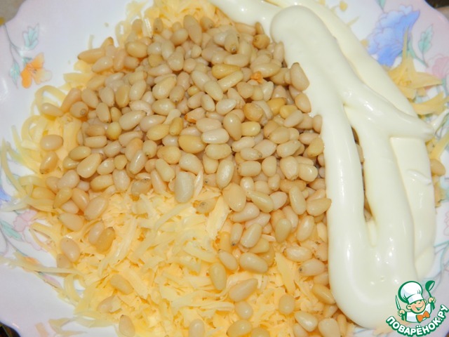 Отдельно смешать тертый сыр, кедровые орешки и майонез.