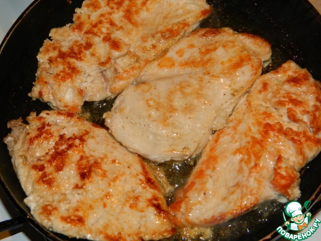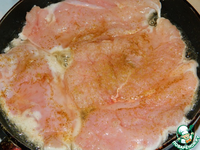 На сковороде обжарить с одной стороны куриное филе. Добавить соль, специи.