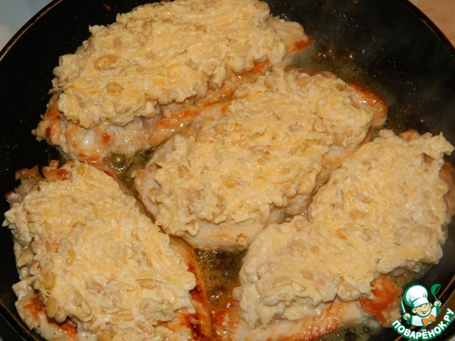 На мясо выложить сырно-ореховую смесь. Накрыть крышкой и оставить тушиться минут 20.