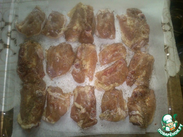 Каждое куриное бедрышко я разрезаю примерно пополам, так и лучше готовится и удобней кушать. Выкладываю на противень (выстеленный пергаментом), солю и приправы по Вашему вкусу, у меня это смесь перцев.