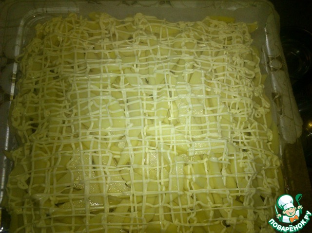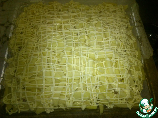 Для того чтобы картофель не был сухим, делаем майонезную сеточку.
