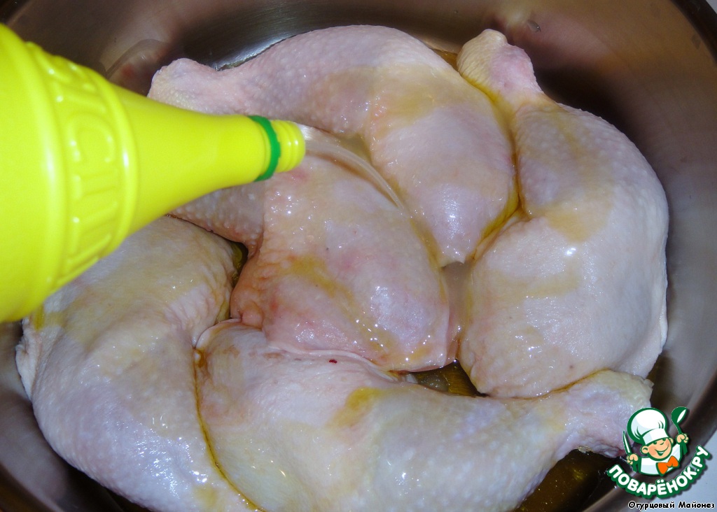 Добавляем их к курице и перемешиваем, чтобы окорочка были со всех сторон обмазаны маринадом. Закрываем крышкой и оставляем мариноваться на полчаса.