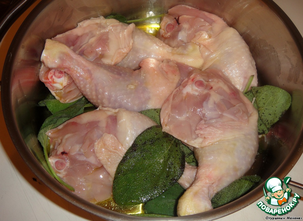 Добавляем шалфей из маринада, убавляем огонь и оставляем тушиться под крышкой ещё 15-20 минут до полной готовности птицы.