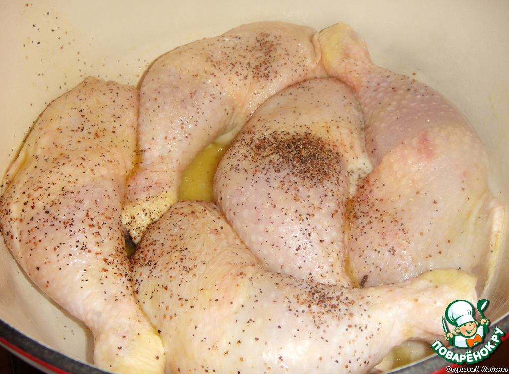 В глубокой сковороде или чугунной кастрюле растапливаем сливочное масло и перекладываем туда курицу. Солим и перчим по вкусу. Обжариваем окорочка с обеих сторон около 20 минут на среднем огне.