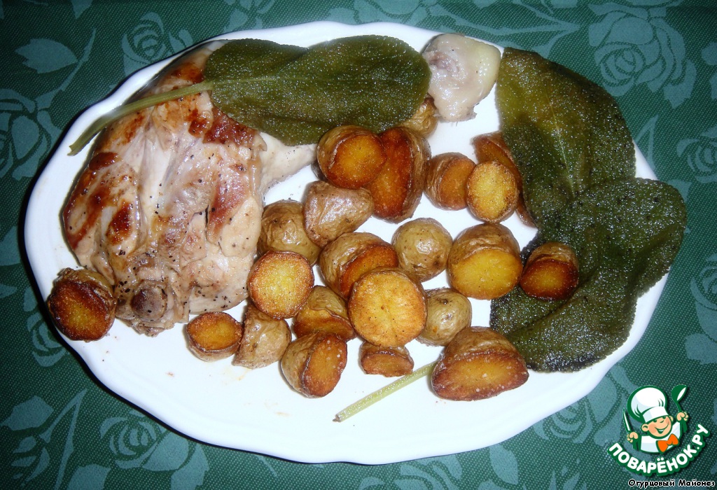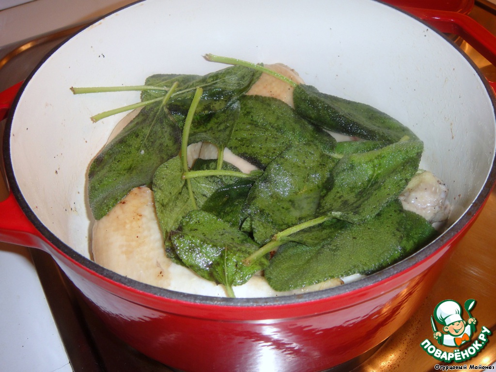 На блюдо вместе с курицей можно выложить и листики шалфея, но всего лишь для украшения, так как в процессе тушения шалфей забирает в себя много жира, а весь аромат отдаёт курице.