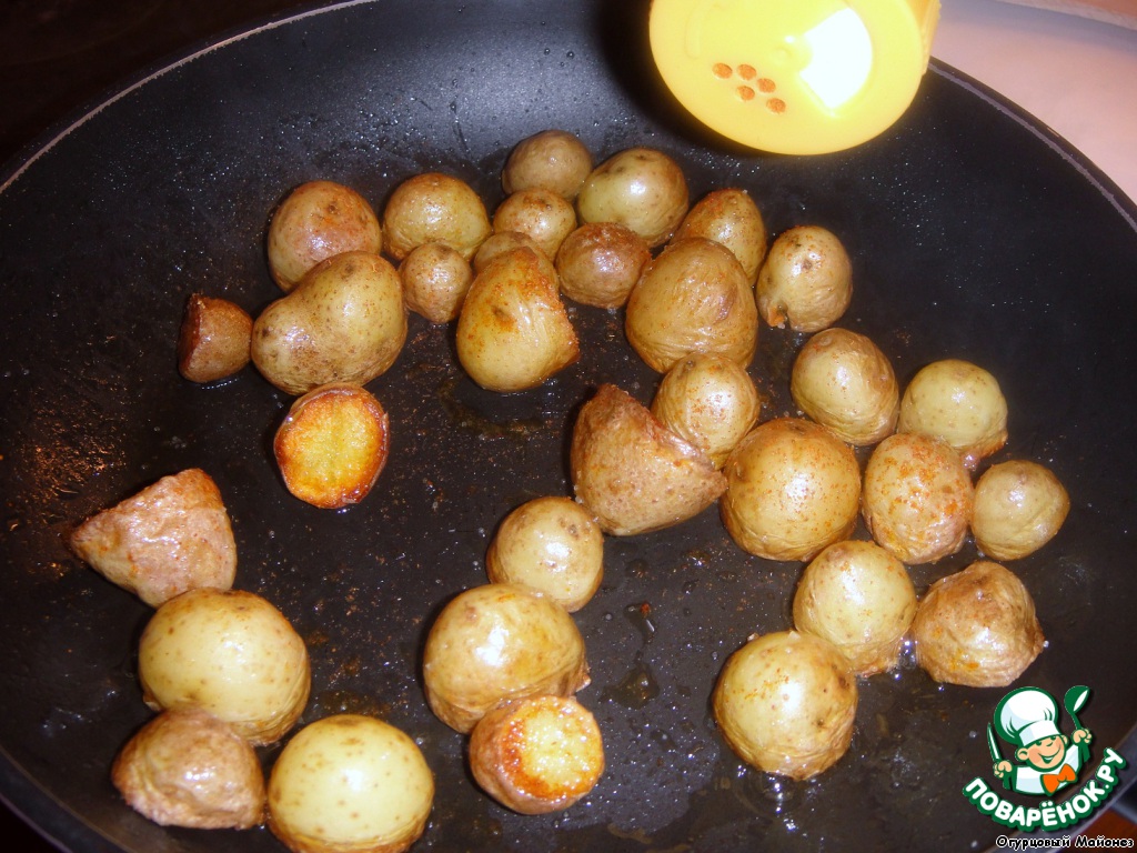 Для гарнира отвариваем мелкий картофель. Разрезаем каждую картофелину пополам и обжариваем на оливковом масле до румяной хрустящей корочки. Сверху посыпаем молотым перцем чили.