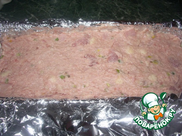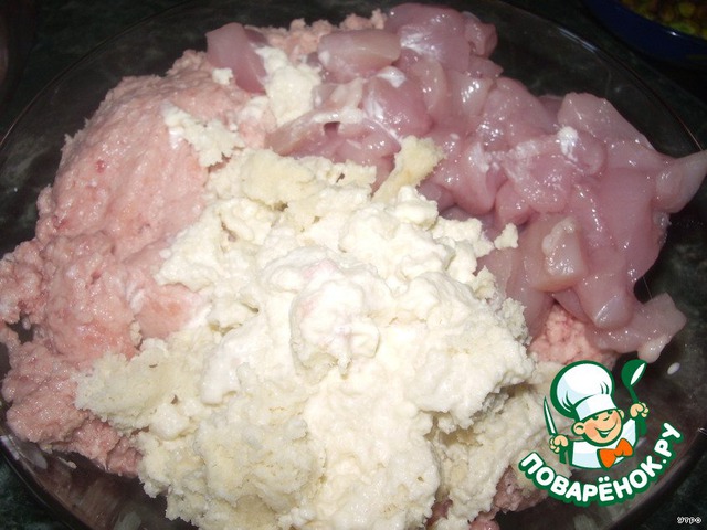 В фарш добавляем размоченный в молоке хлеб, порезанную кусочками ножами Scarlett грудку и ветчину, белок, соль, перец и тщательно вымешиваем.