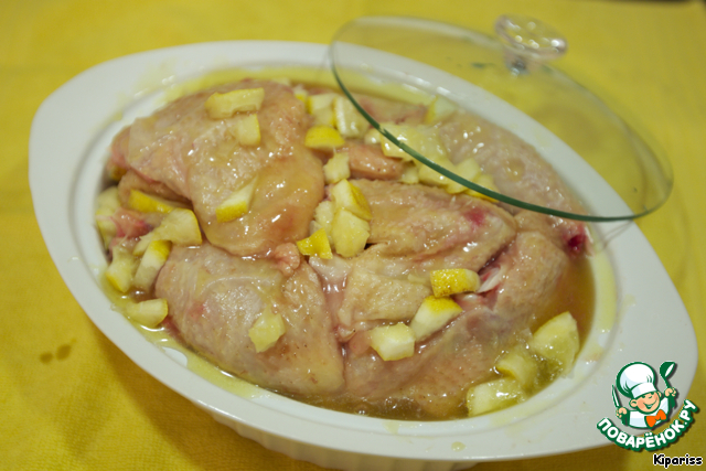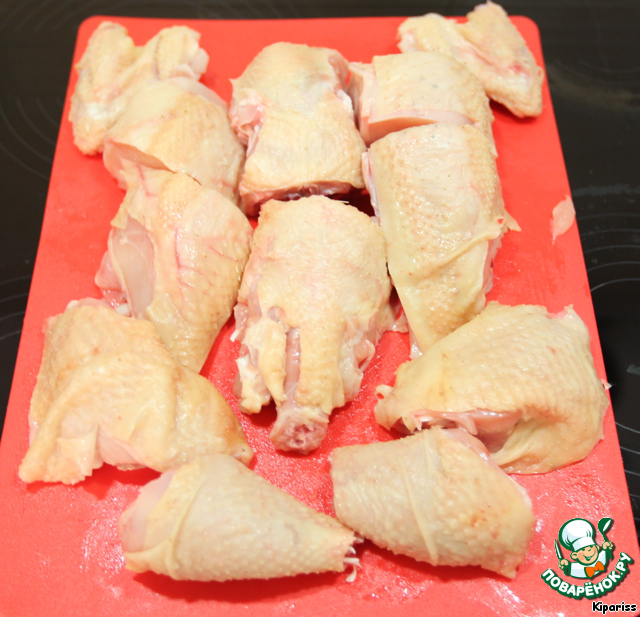 Курицу разделайте на порционные куски. Посолите и обильно поперчите.