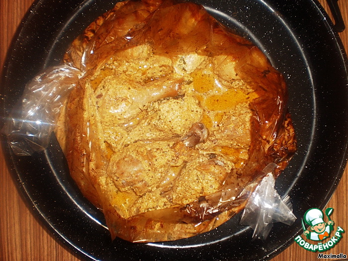 За 10 мин. до окончания, рукав разрезать посередине и дать курочке подрумянится. Соком, который выделился, полить каждый кусочек.