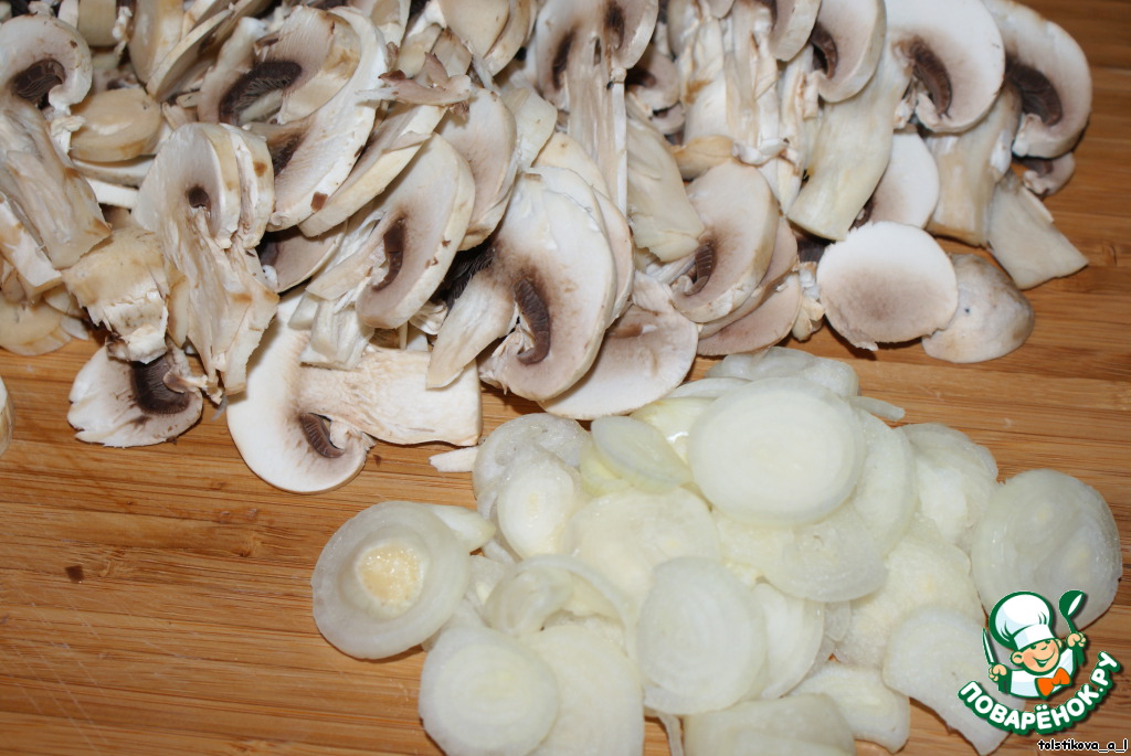 Нарезать шампиньоны пластинами, репчатый лук кольцами.