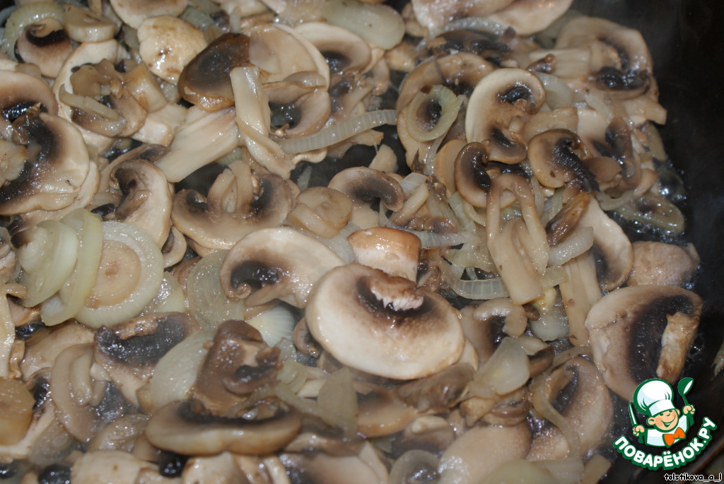 Обжарить грибы и лук на подсолнечном масле, посолить, убрать с огня.