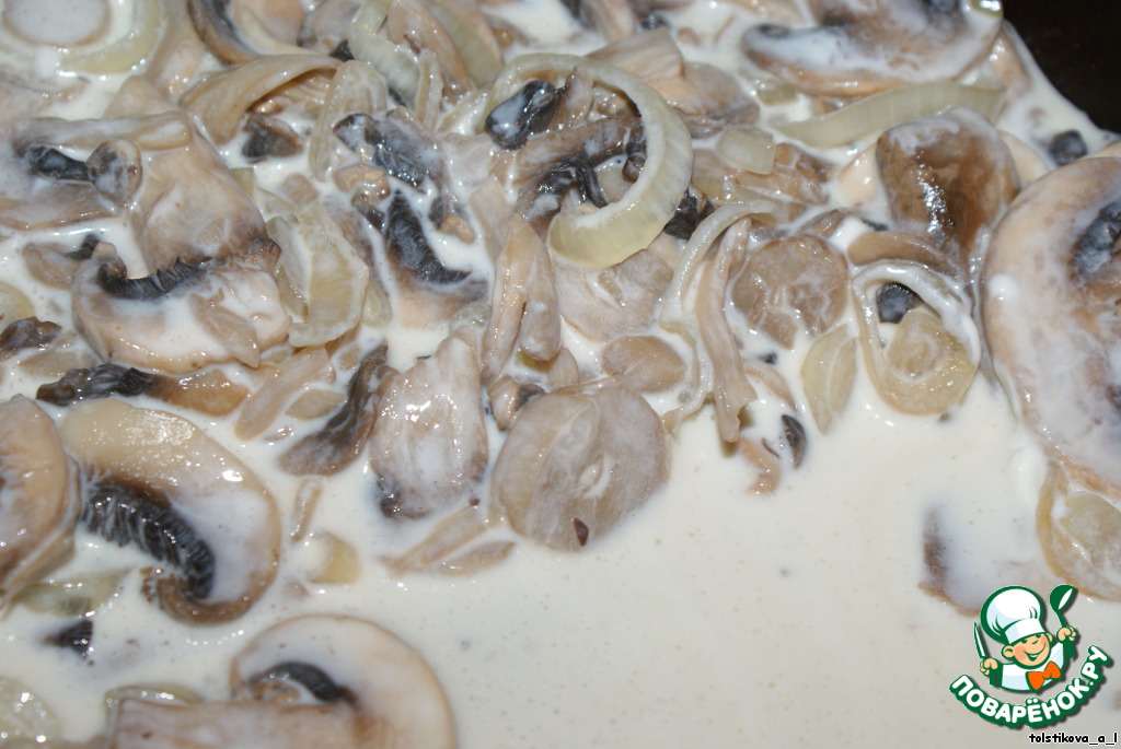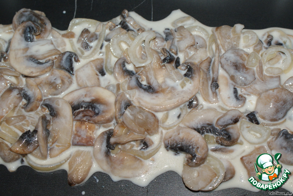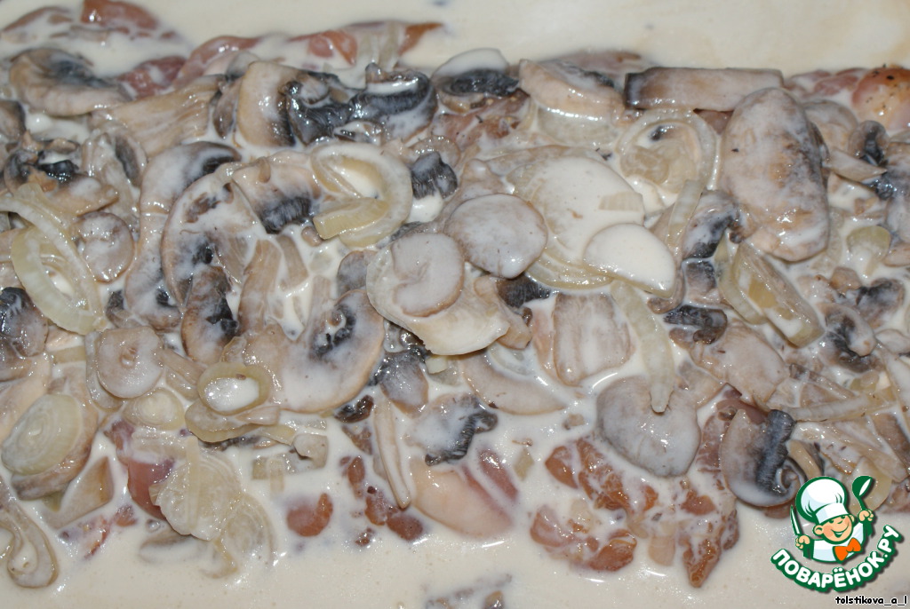 В форму для запекания уложить 1/2 часть шампиньонов.