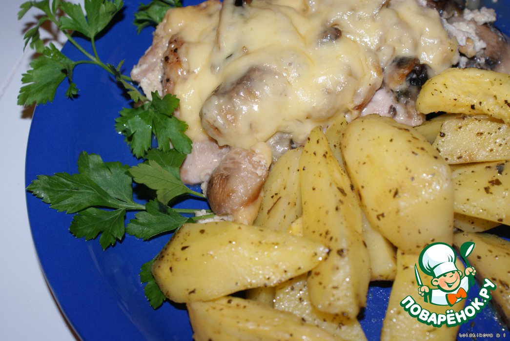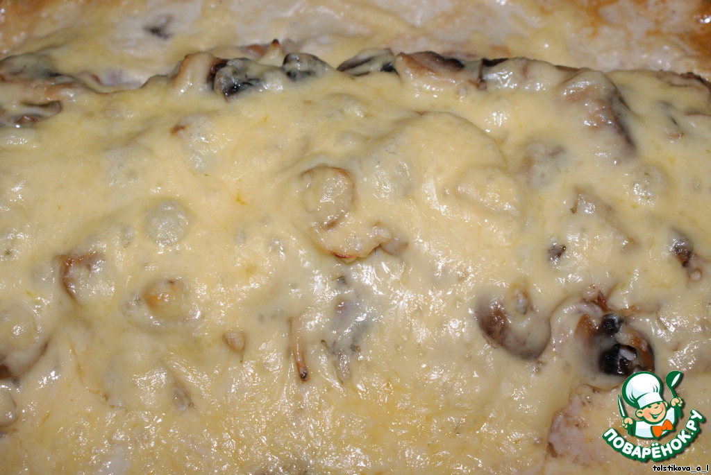 | Нежное куриное филе, запеченное с шампиньонами в сырной шапке. |