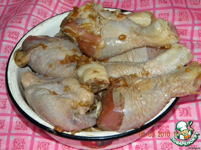 Натереть крылышки и ножки маринадом, переложить в подходящую посуду, залить оставшимся маринадом и убрать в холодильник мариноваться на 4-6 часов (лучше оставить на ночь).