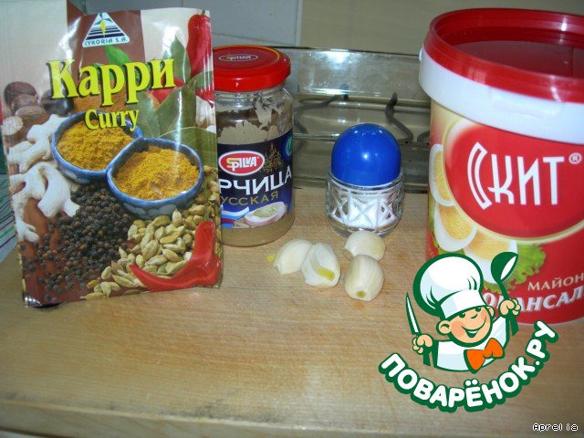 Выдавливаем чеснок в баночку, кладем туда горчицу, майонез, карри, все перемешиваем.