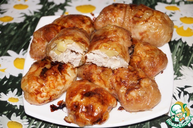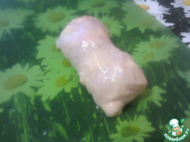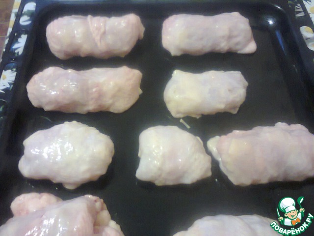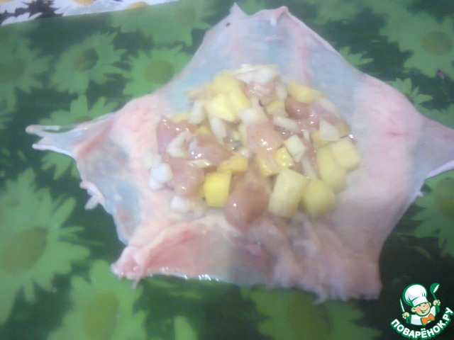 Разложить куриную кожу, положить начинку и аккуратно завернуть.