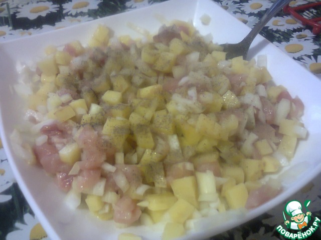 Фото ингредиентов забыла сделать. Грудку, картофель и репчатый лук (80 г, в ингредиенты добавить не смогла, глюк на сайте какой-то) нарезать кубиками, смешать, посолить, добавить специи по желанию. Я добавляю только соль и перец.