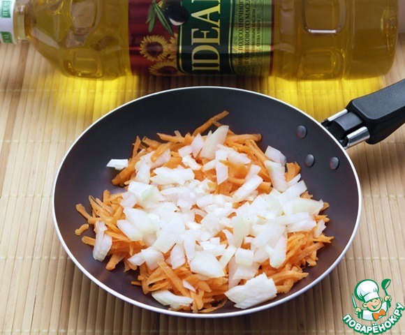 Морковь потереть на крупной терке, лук порезать мелким кубиком.