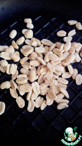 На сухой сковороде обжариваем до золотистого цвета арахис. Перекладываем его в тарелочку.