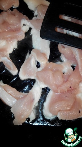 На разогретом растительном масле в течение 5 минут обжариваем тонко нарезанную куриную грудку. Перекладываем в тарелочку.