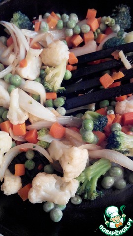 Добавляем в сковороду цветную капусту (свежую разобрать на соцветия, замороженную обдать кипятком) или цветную капусту и брокколи, морковь нарезанную кубиками или брусочками и зеленый горошек. Тушить минут 5, периодически помешивая.