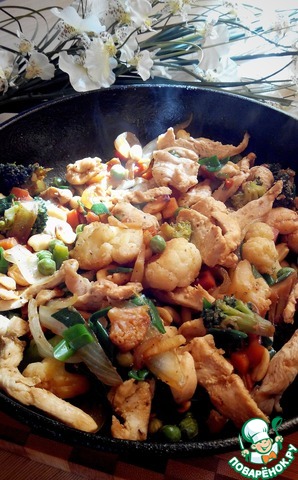 Добавляем к овощам грудку и арахис. Вливаем соевый соус, посыпаем кориандром, перцем чили и свежемолотым черным перцем. Перемешиваем и тушим еще минуты 3-4.