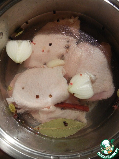 Для начала приготовим бульон. Курицу промываем и разрезаем на куски, если брали целую (у меня бедра). Затем курицу выкладываем в кастрюлю, добавляем очищенный лук, чеснок и пряности (корица, лавровый лист, кардамон, перец горошком, соль). Доводим до кипения, снимаем образовавшуюся пену и варим курицу до готовности.