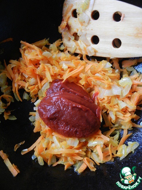 Добавляем морковь, перемешиваем и тушим около 3-х минут. Затем добавляем томатную пасту и перемешиваем еще раз.