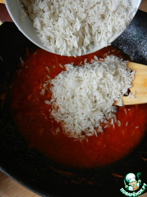 Итак, добавляем промытый рис и готовим все вместе на маленьком огне, не забывая периодически помешивать. Готовим до тех пор, пока жидкость полностью не впитается. Затем кастрюлю накрываем крышкой и томим еще минут 15, чтобы рис "дошел"