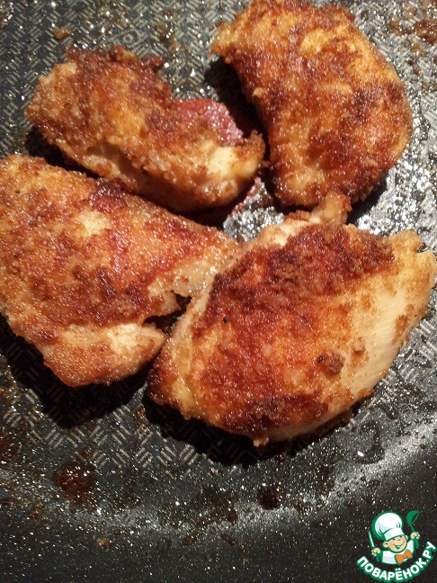 Готовую курицу достаем и охлаждаем, а бульон процеживаем. Затем кусочки курицы обваливаем в панировочных сухарях и обжариваем на хорошо разогретой сковороде до золотистого цвета.