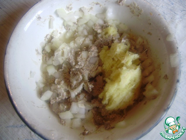 Добавляем мелко прорезанную луковицу, натертый имбирь и сок лимона.