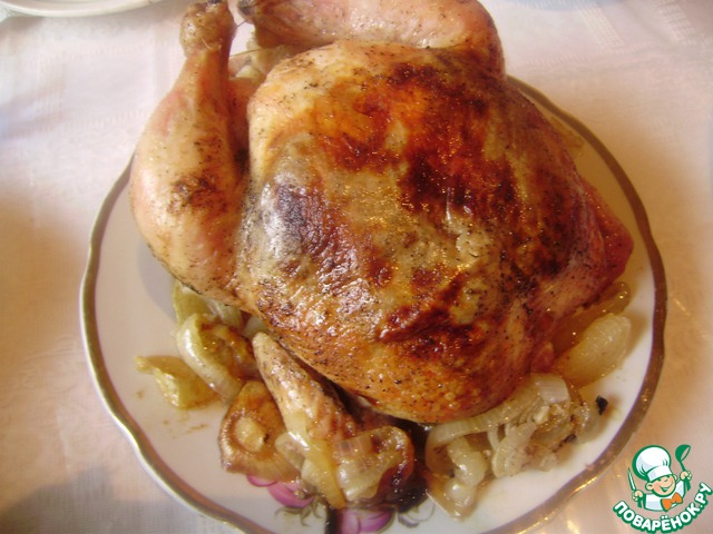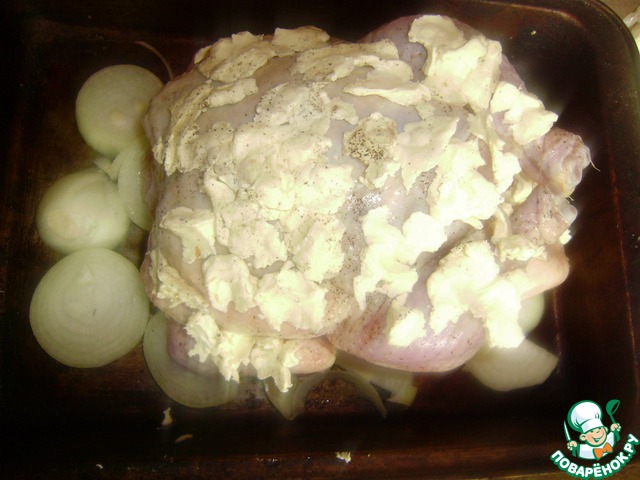 Курочку обильно натираем сверху солью и перцем, а также хорошенько распределяем по ней масло (можно так же немного масла положить внутрь). Ноги курочке связываем ниткой и выкладываем ее на лук, при этом крылья подвернув под курочку.