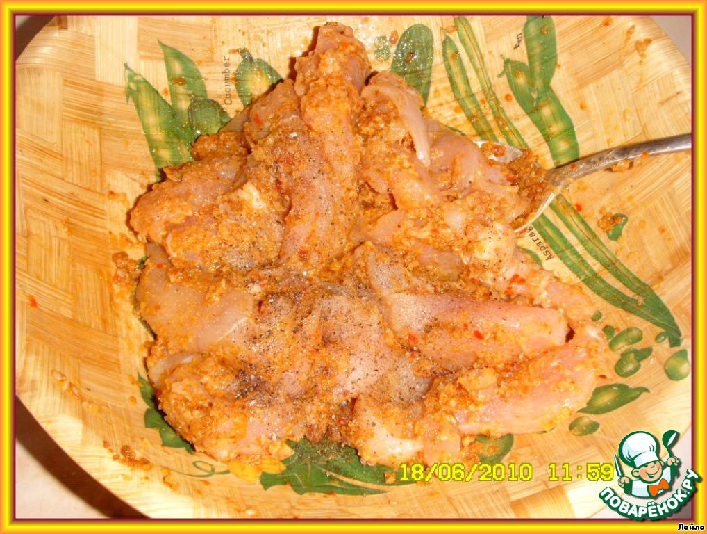 Нарежьте курицу на полоски и смешайте с маринадом. [i]Как и в любом маринаде - чем дольше лежит курочка, тем вкуснее.[/i]