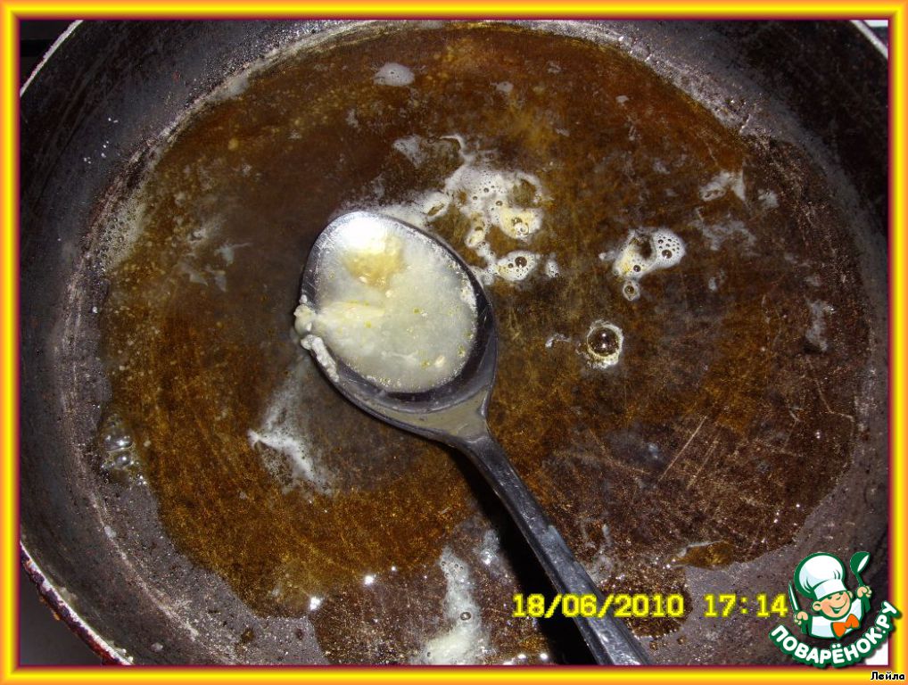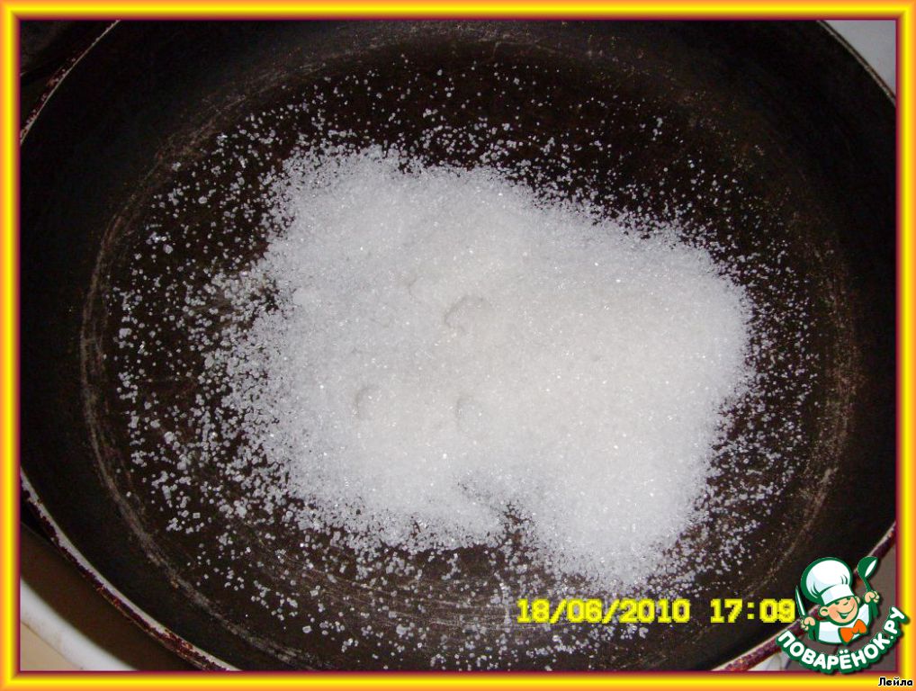 Высыпьте сахар в сковородку и нагревайте, пока сахар не превратится в карамель (за сахаром нужно постоянно следить, чтобы он не сгорел!).