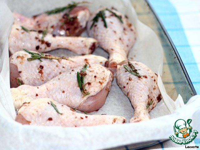 Куриную голень обмыть, обсушить бумажным полотенцем. Соединить соус со специями и "иголками" розмарина, перемешать. Голень сложить в глубокую посуду, залить маринадом и оставить на 30-40 минут. Затем огнеупорную форму выстелить пергаментом, выложить голень, полить оставшимся соусом и запечь в разогретом духовом шкафу около 30-35 минут до золотистой корочки.