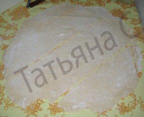 Раскатать тесто в пласт, толщина 0,5 см, на посыпанной мукой поверхности
