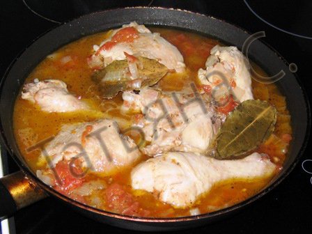 Курицу разрезать на кусочки. В сковороду налить немного подсолнечного масла, положить курицу. Помидор очистить от кожицы, порезать кусочками, добавить к курице. Лук покрошить, добавить. Посолить, поперчить по вкусу. Тушить сначала на сильном огне 5 минут, затем на медленном 30 - 40 минут под крышкой, незабывая переворачивать. За 5 минут до готовности, положить лавровый лист.