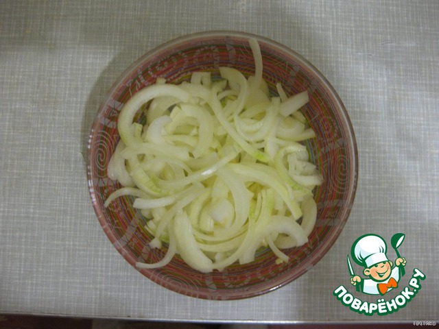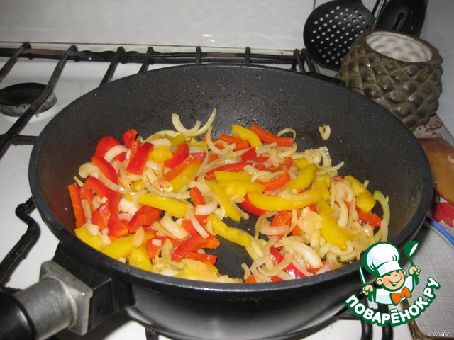 В этой же сковородке в течение 3 минут обжарить лук и перец.