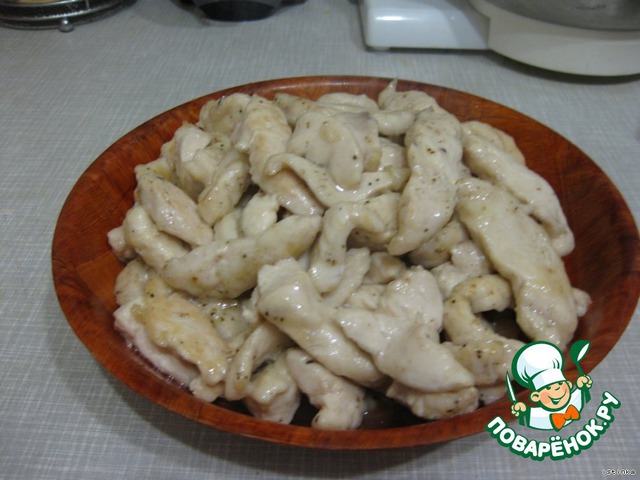 Куриные грудки нарезать длинными брусочками шириной около сантиметра.