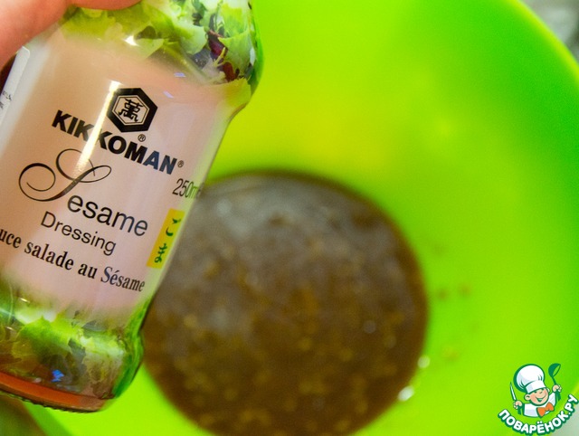 Смешать соевый соус, кунжутный соус, цедру 1 лимона, сок 1/2 лимона.