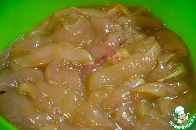 Курицу нарезать тонкими полосками и замариновать в соусе минимум на 20 минут.