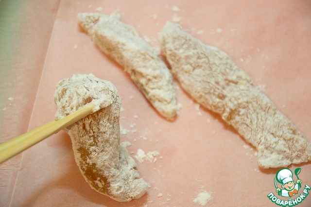 В миску выложить крахмал и обвалять в нем каждый кусочек. Выложить на вощеную бумагу.